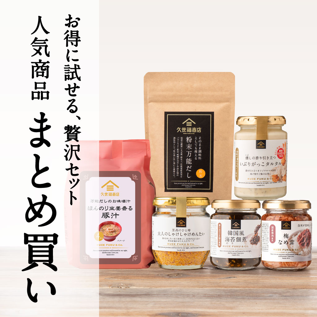 久世福さんを初めての利用でしたので、導入に良さそうなこの商品にしました。しゃけしゃけめんたいは少しピリ辛でご飯との相性も良いですし、あんバターも美味しかったです。 また他の商品も色々購入します。