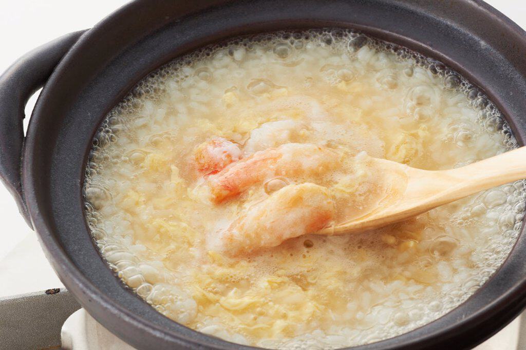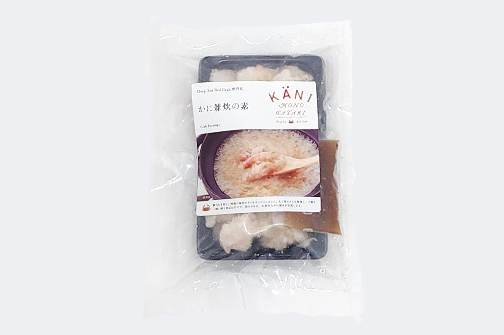 蟹の剥き身と、特製の雑炊のタレをセットにしました。剥き身とタレを解凍し、ご飯と一緒に軽く煮込むだけで、ひと味もふた味も深みのある、本格的なかに雑炊が完成します。