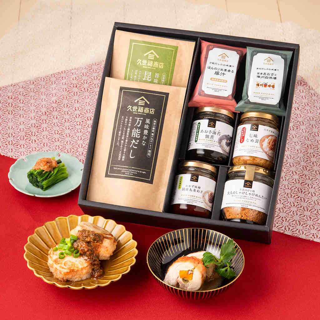 久世福で大人気の万能だし、七味なめ茸、お味噌汁など豪華8商品、和食の魅力が詰まったギフトです。