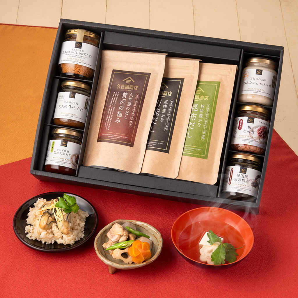 久世福商店で人気の「万能だし」や「大人のしゃけしゃけめんたい」に加え、新しく「梅なめ茸」や「しゃけマヨ」などが登場。和食がもっと楽しくなるごはんのお供の豪華ギフトです。素材の旨みを活かした逸品は、忙しい日でも手軽に“ごちそう気分”が味わえます。