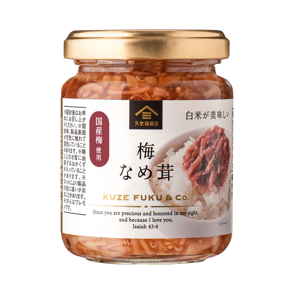 | 原材料名 | えのき茸(長野県)、梅肉、調味梅漬(梅、食塩、その他)、砂糖、しょうゆ、本みりん、水あめ、鰹だし、うめ濃縮果汁、かつお節エキス、昆布だし、酵母エキス、寒天/クチナシ赤色素、甘味料(ステビア)、しそ香料、乳酸Ca、(一部に小麦・大豆を含む) |