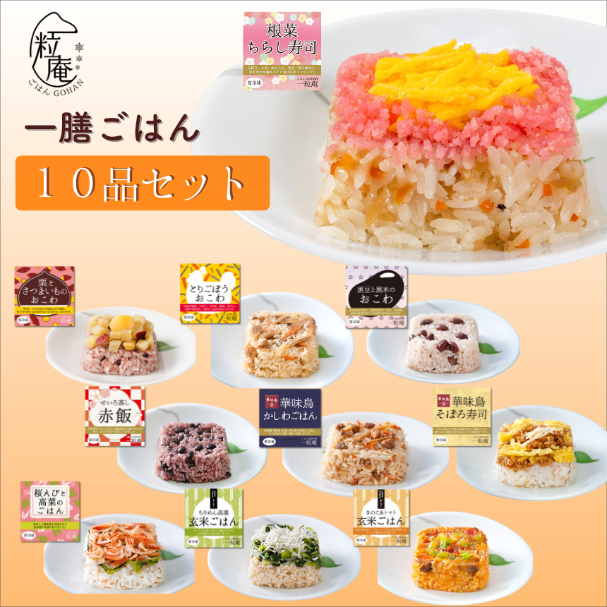 125g×10個 (ちりめん高菜玄米ごはん、きのこ&トマト玄米ごはん、せいろ蒸し 赤飯、黒豆と黒米のおこわ、栗とさつまいものおこわ、とりごぼうおこわ、根菜ちらし寿司、華味鳥のかしわごはん、華味鳥のそぼろ寿司、桜えびと高菜のごはん) |