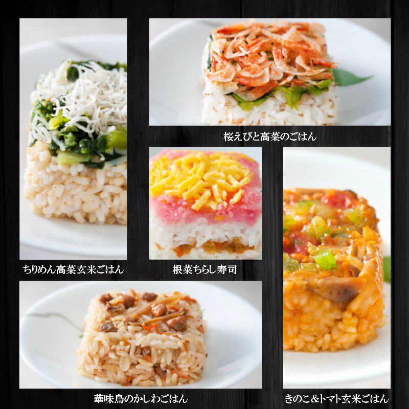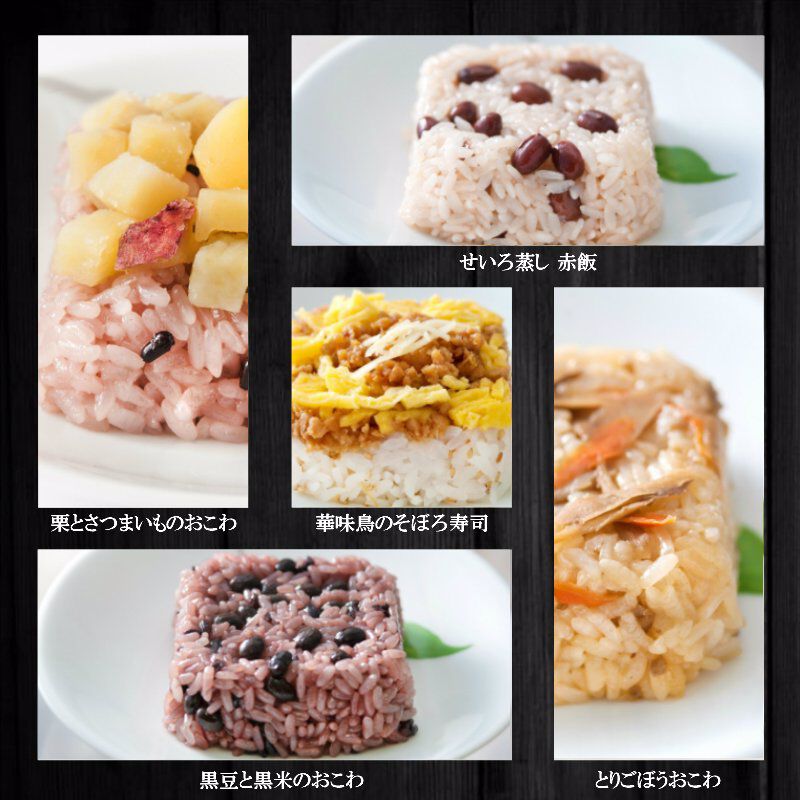 玄米ごはんや炊き込みごはん、おこわやちらし寿司などバラエティ豊かな個食ごはんの詰合せです。