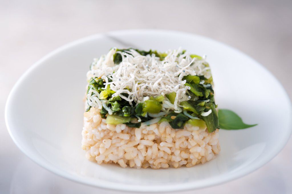 圧力釜でふっくら炊いた玄米に国産のちりめんと高菜の塩漬けをトッピングした玄米ごはんです。