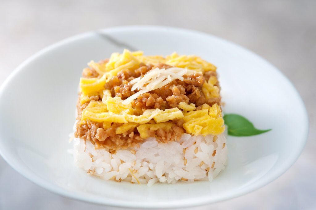 生姜の効いた鶏そぼろ(華味鳥)と酢飯との味わいは絶妙です。