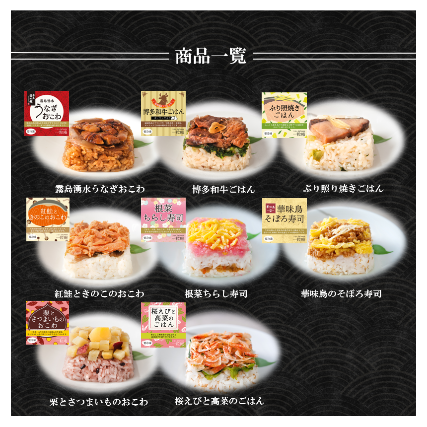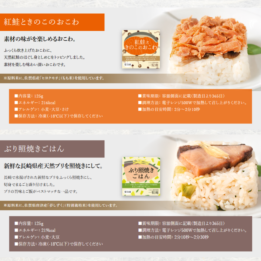 ●ぶり照焼きごはん:米(佐賀県産)、ぶり照焼〔ブリ(国産)、糖類(砂糖、水あめ)、たん白加水分解物、しょうゆ、米発酵調味料、食塩、酵母エキス〕、高菜塩漬〔高菜(国産)、食塩〕、昆布エキス、しょうが(国産)、しょうゆ、砂糖、植物油、本葛粉(国産)/調味料(アミノ酸等)、カイワレエキス、(一部に小麦・大豆を含む) ●紅鮭ときのこのおこわ:もち米(佐賀県産)、紅鮭ほぐし身(紅鮭、食塩、砂糖)、ぶなしめじ(国産)、みりん、醤油、清酒、植物油、(一部に小麦・大豆・さけを含む) ●博多和牛ごはん:米(佐賀県産)、牛肉(福岡県産)、高菜塩漬〔高菜(国産)、食塩〕、野菜〔ぶなしめじ(国産)、玉ねぎ(国産)〕、昆布エキス、にんにく(国産)、しょうゆ、洋酒、植物油、食塩、黒こしょう/調味料(アミノ酸等)、カイワレエキス、カラメル色素、(一部に小麦・大豆・牛肉を含む) ●霧島湧水うなぎおこわ:もち米(佐賀県産)、うなぎ蒲焼〔うなぎ(鹿児島県産)、しょうゆ、砂糖、みりん、水あめ、発酵調味料〕、ごぼう(国産)、たれ(砂糖、果糖ぶどう糖液糖、しょうゆ、しょうゆ風調味料、米発酵調味料、糖加工品、食塩、たん白加水分解物、酵母エキス)、水あめ、しょうゆ、植物油/増粘剤(加工でん粉、増粘多糖類)、(一部に小麦・大豆を含む) ●栗とさつまいものおこわ:もち米(佐賀県産)、さつまいも(国産)、栗甘露煮、水あめ、黒米(国産)、植物油、食塩 ●根菜ちらし寿司:米(佐賀県産)、調味酢(砂糖、醸造酢、食塩)、野菜〔人参(国産)、ごぼう(国産)、筍(国産)、蓮根(国産)〕、錦糸玉子(鶏卵、砂糖、食酢、澱粉分解物、植物油脂、食塩)、おぼろ、砂糖、しょうゆ、コンブエキス、水あめ、かつお節エキス、植物油、みりん、清酒、乾しいたけ/加工でん粉、調味料(アミノ酸等)、カイワレエキス、コチニール色素、(一部に小麦・卵・大豆を含む) ●華味鳥のそぼろ寿司:米(佐賀県産)、鶏そぼろ〔鶏肉(国産)、しょうゆ、砂糖、粒状大豆たん白、料理酒、みりん、鶏脂(国産)〕、調味酢(砂糖、醸造酢、食塩)、錦糸玉子、たけのこ(国産)、白ごま、しょうが(国産)、水あめ、植物油/加工デンプン、カイワレエキス、調味料(アミノ酸)、カラメル色素、(一部に小麦・卵・大豆・鶏肉・ごまを含む) ●桜えびと高菜のごはん:米(佐賀県産)、高菜塩漬〔高菜(国産)、食塩〕、桜えび(台湾産)、白ごま、植物油/カイワレエキス、(一部にえび・ごまを含む) |