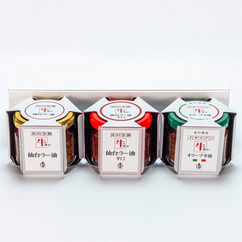 | 内容量 | 牛タン仙台オリーブ辛油(100g×1)、牛タン仙台ラ-油(100g ×1)、牛タン仙台ラ-油辛口(100g×1) |