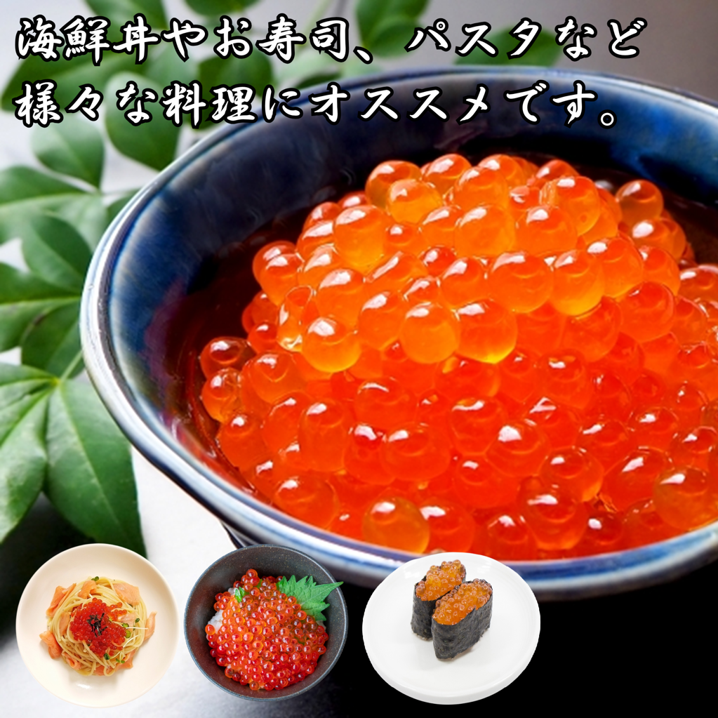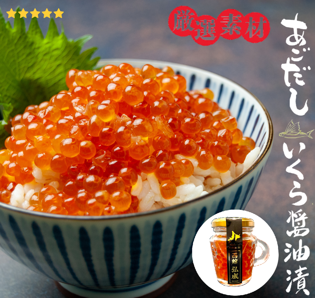 鮭卵(北海道産)、醤油、みりん、酒、食塩、昆布エキス(国内製造)、かつお節エキス(国内製造)、根昆布、砂糖類(乳糖、砂糖)、風味原料(焼きトビウオ粉末)、酵母エキス、発酵調味料/調味料(アミノ酸等)、増粘多糖類 アレルギー表示:いくら、大豆、小麦、乳成分 |