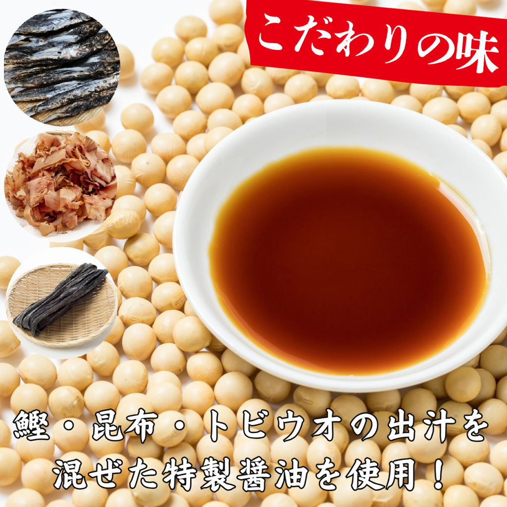 あご出汁をベースにかつお・昆布だしを合わせた秘伝の醤油ダレに漬け込み皮が残らず、口いっぱいに旨味が広がります。