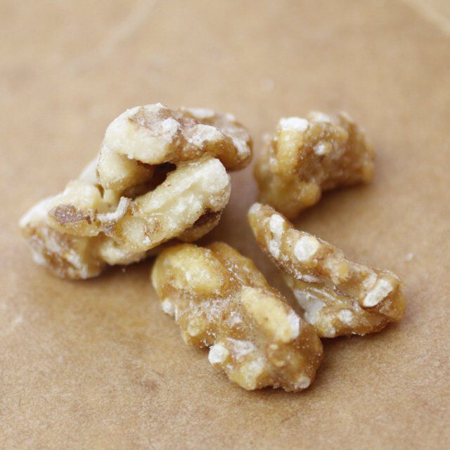 カリッとしたコーティングはキャラメル風味に塩がアクセント。メーカー独自の製法で、2種類の塩を隠し味に使用したキャラメルソースをローストしたくるみにからめて熱風乾燥で仕上げました。濃厚なキャラメルソースにローストされたくるみが絶妙にマッチした商品です。
