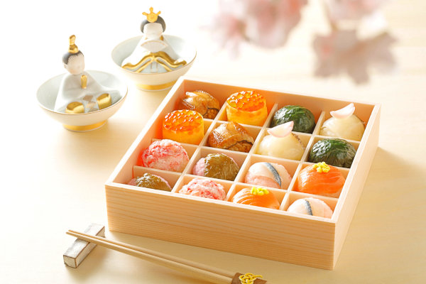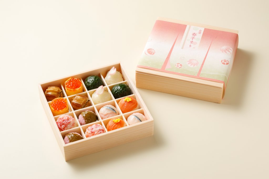 宝石箱のように美しい、一つ一つが洗練された美味しさを持つ「手まり寿し」。春らしさを演出した7種の手まり寿司と、甘味が1種入った鮮やかなセット。