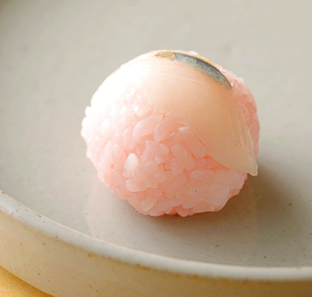 春を告げる魚ともいわれる「さより」の身を自社で丁寧に仕込み、桜色のシャリと合わせました。