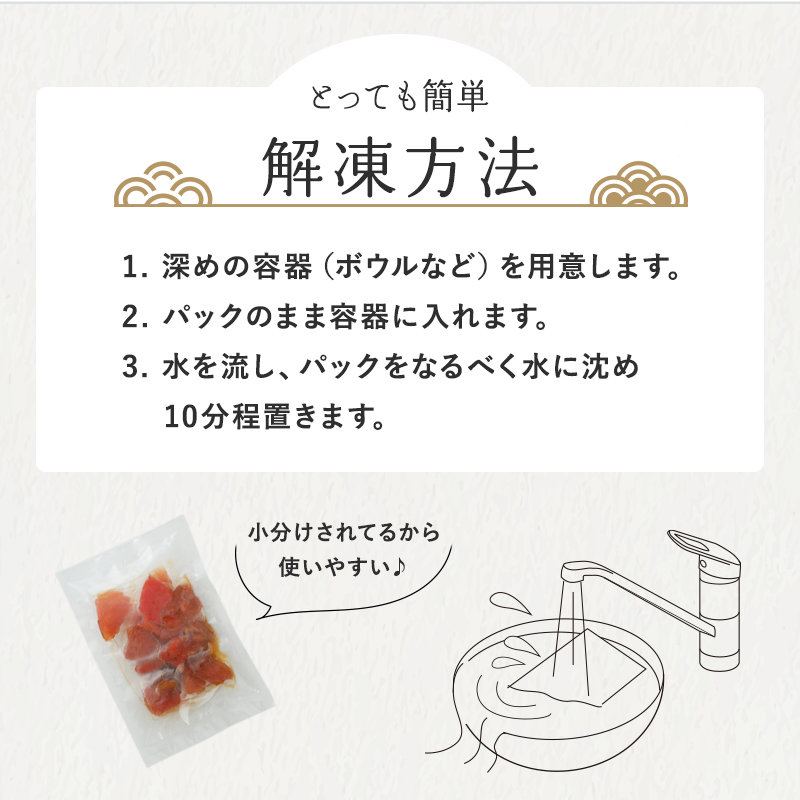 解凍は、パックのままボウルなど深めの容器に入れ、10分流水につけるだけ。全てスライス済でお手軽にマグロをお召し上がりいただけます。