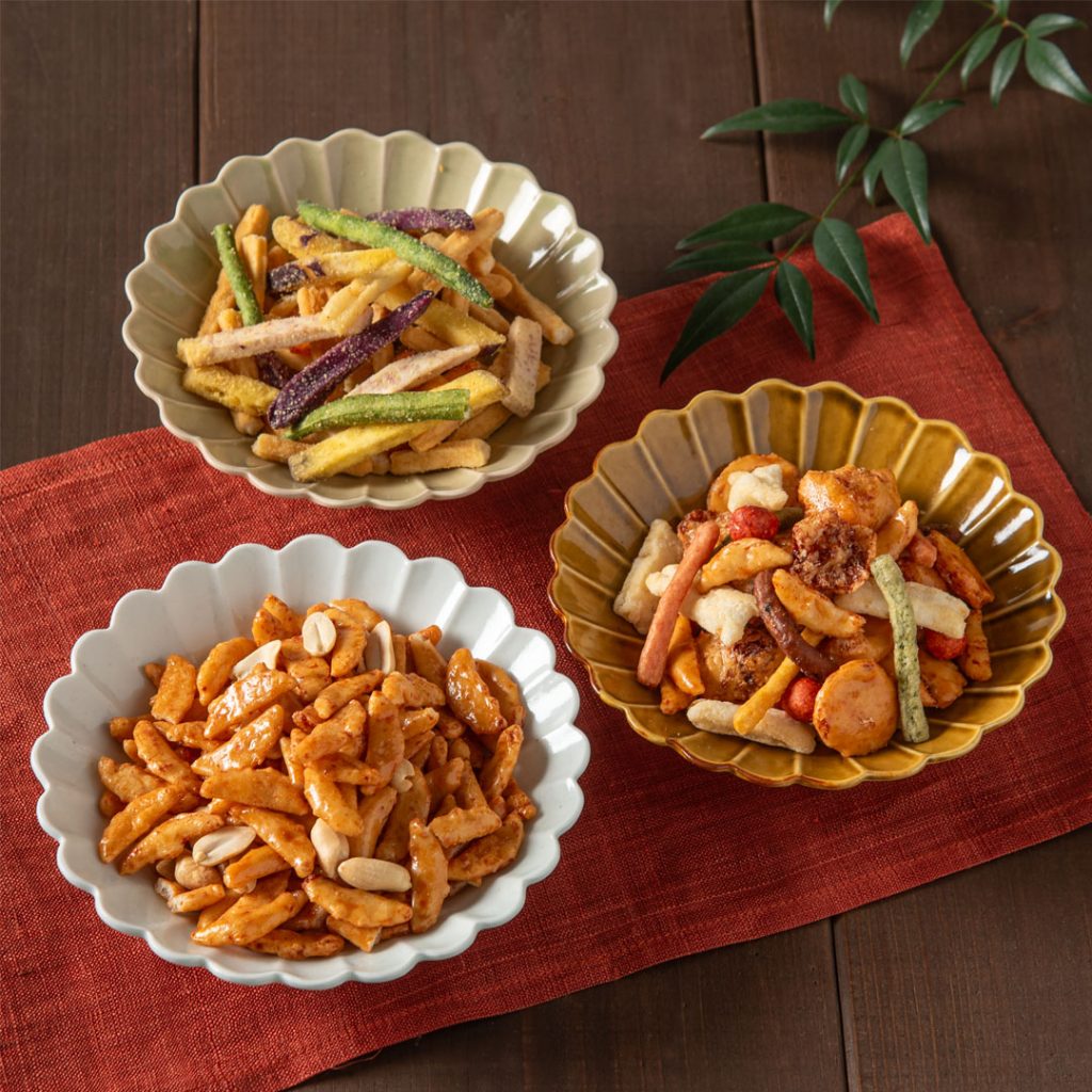 ピーナッツ揚げ、醤油おかき、伝統製法の柿の種、野菜かりんとう、丸焼しょうゆ、しょうゆ豆、いか天 ―― 7種類の昔懐かしいおやつを、ポットいっぱいに詰め込みました。