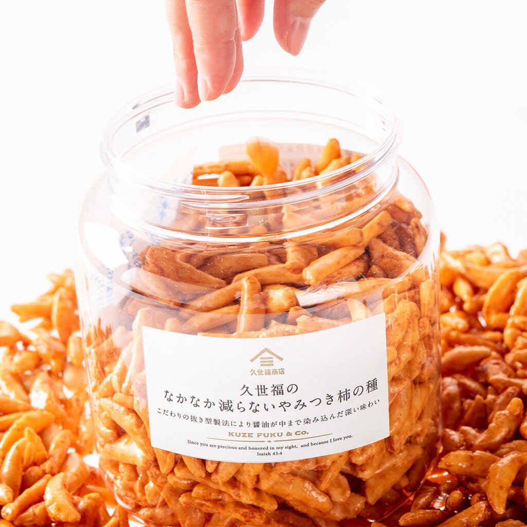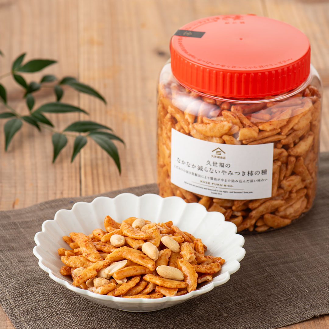 オープン直前の初回納品はわずか5ケース(40個)。ところが、オープン後に100ケース(800個)の注文に膨らみ、「なかなか減らないやみつき柿の種」は一躍、久世福の顔になりました。