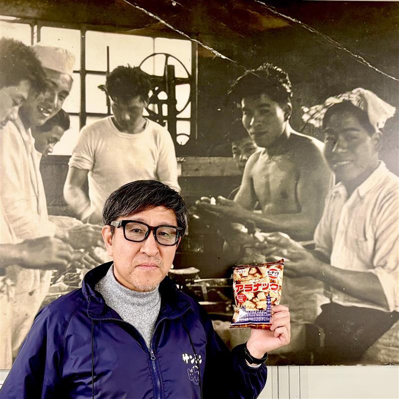 株式会社三真の4代目社長。伝統製法の柿の種を守り抜き、作り伝え続ける一方で、ご自身の自由な表現の場、そして社員の挑戦の場として、商品作りの過程を楽しまれています。