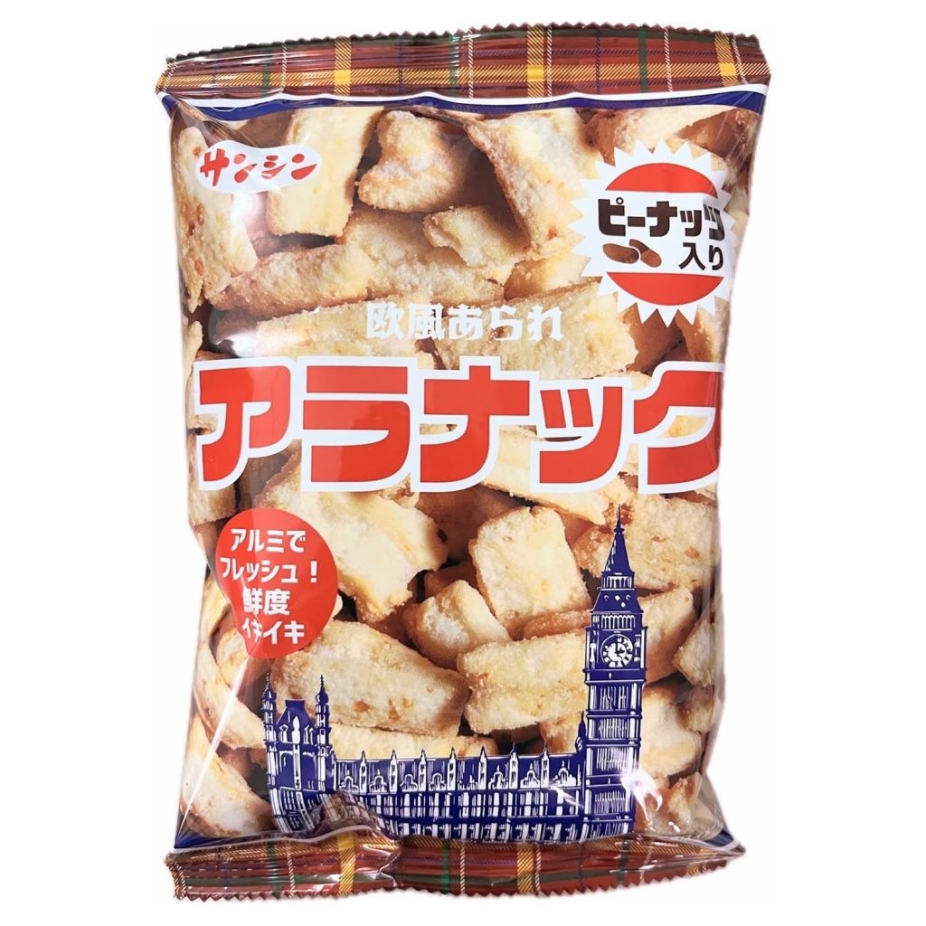 “げんこつ”と“アラナック”の2種類あられだけでした。“ピーセン”の名前は使えないので、あられスナック=“アラナック”ですね。