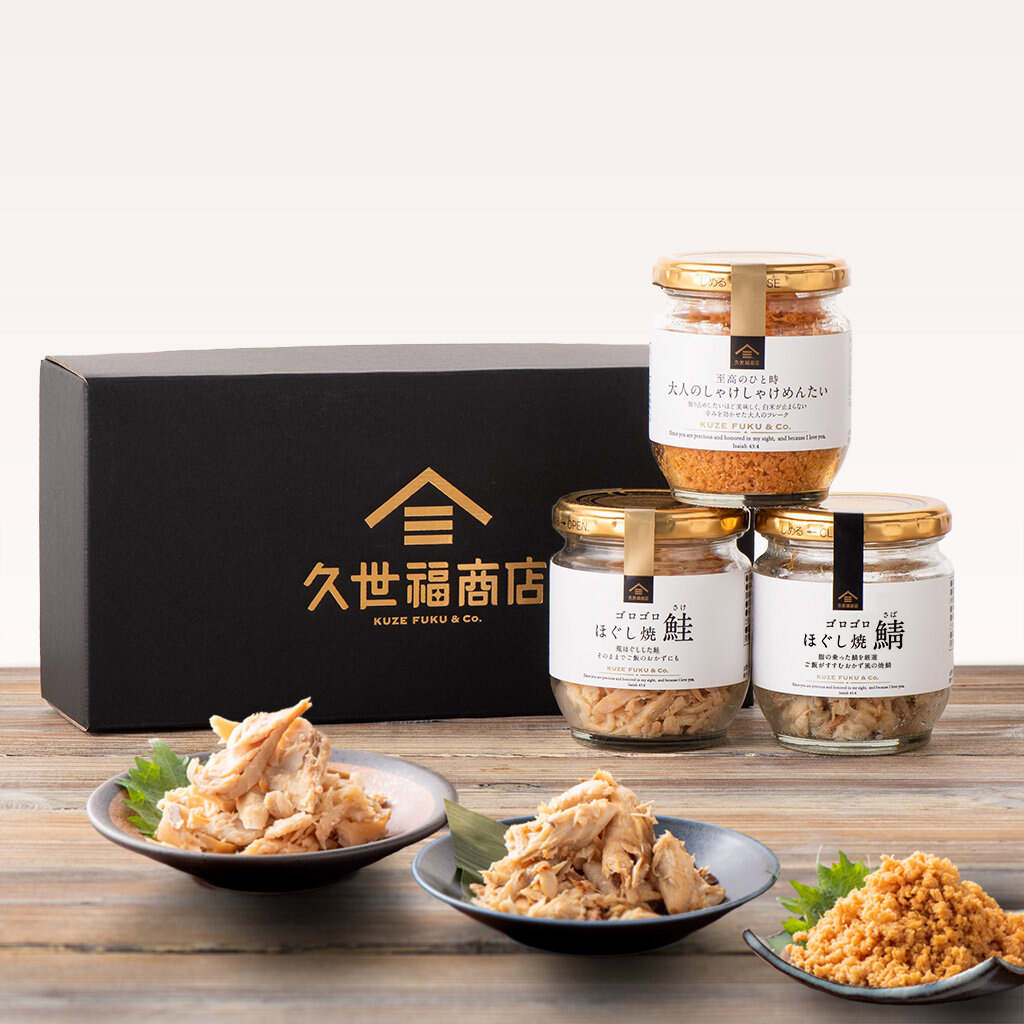 丁寧に焼き上げた魚の身を大きくほぐした、「ゴロゴロほぐしシリーズ」の鮭と鯖を、人気の「大人のしゃけしゃけめんたい」とセットにしました。ゴロっと大きな身は、お茶づけやおにぎりの具、酒の肴など色んな場面で大活躍。新生活で楽しめるギフトです。
