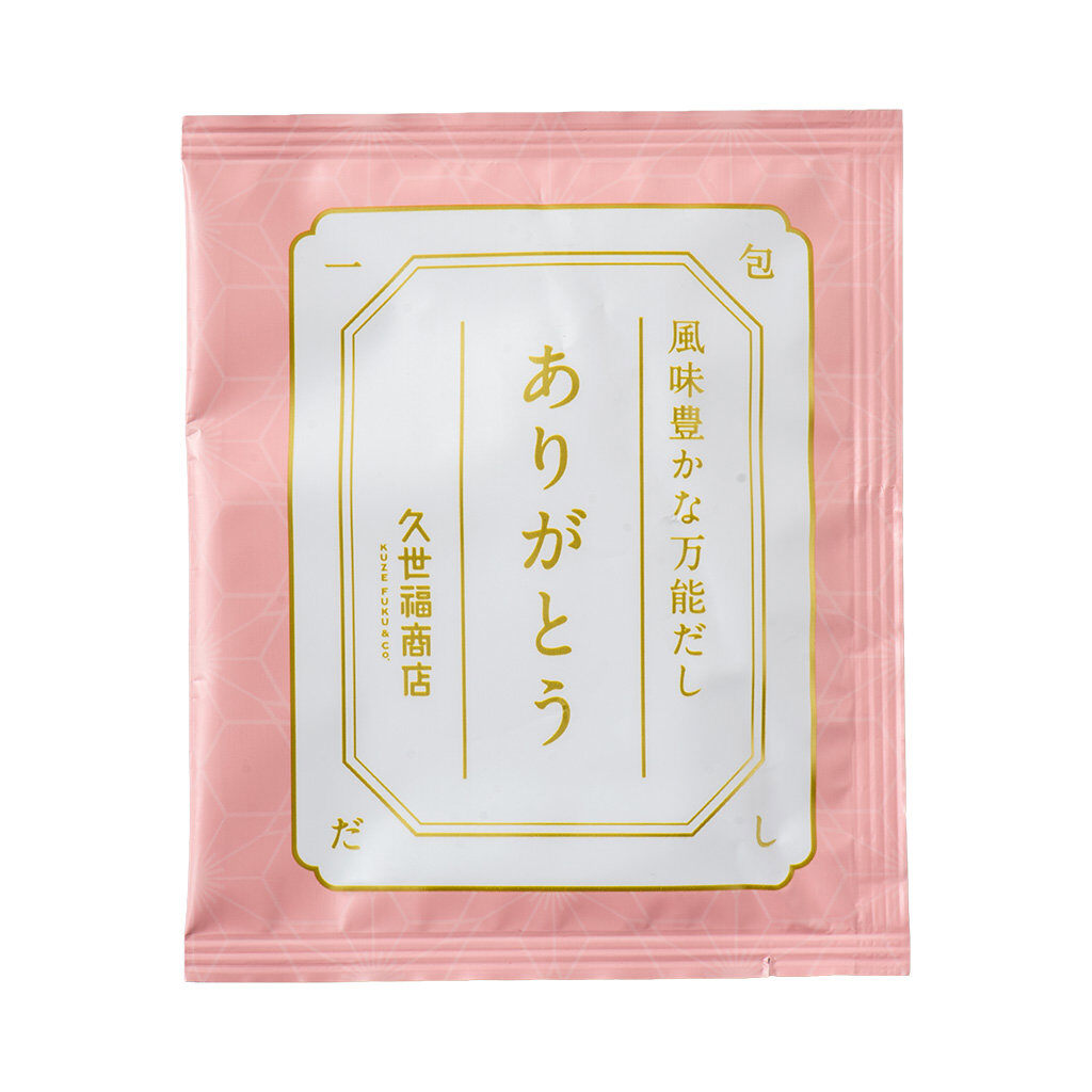 久世福商店一番人気の万能だしの出汁パックを「ありがとう」と書かれた優しい桃色の袋に入れました。嵩張らないので、大勢の方へちょっとした感謝を伝えるのに最適。ありがとうの言葉と一緒に、久世福自慢の出汁で心安らぐひと時を贈りませんか?