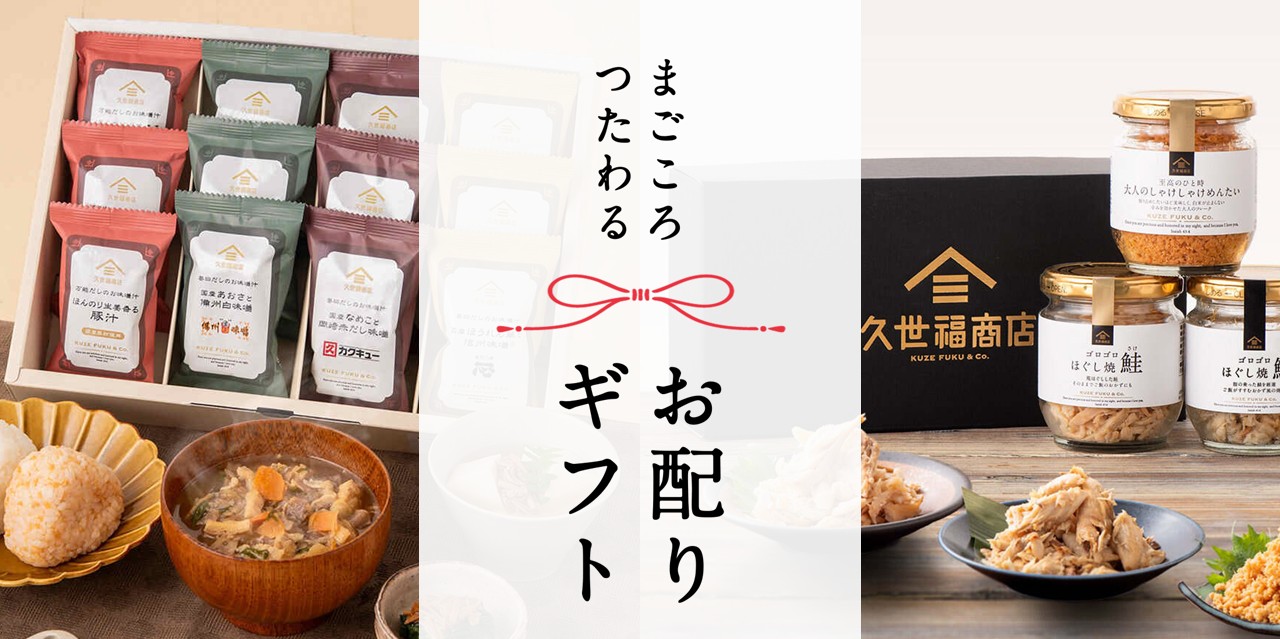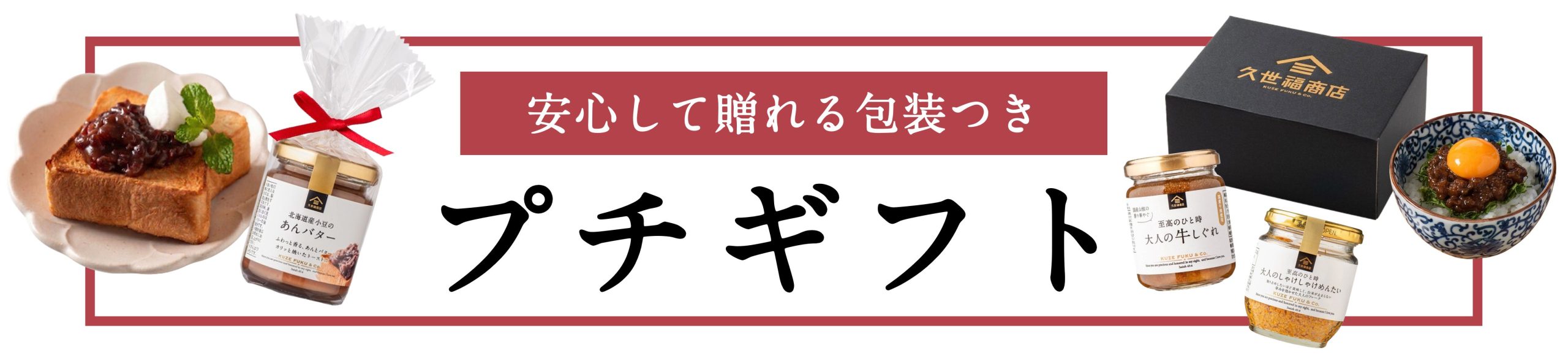 久世福で人気のご飯のお供やジャムを上品な化粧箱やギフト袋に入れて丁寧に包みました。のしやメッセージカードもつけられるので、感謝の想いを伝えるのに最適です。