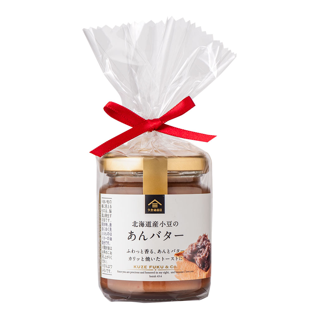 メディアで話題の久世福商店の人気商品「あんバター」のギフト。北海道産の小豆で作ったあんとコクのあるバターが風味豊かに広がるパンのお供にリボンをかけてギフトにしました。ちょっとしたお礼やお返し、ばらまき、イベント販促などにおすすめです。