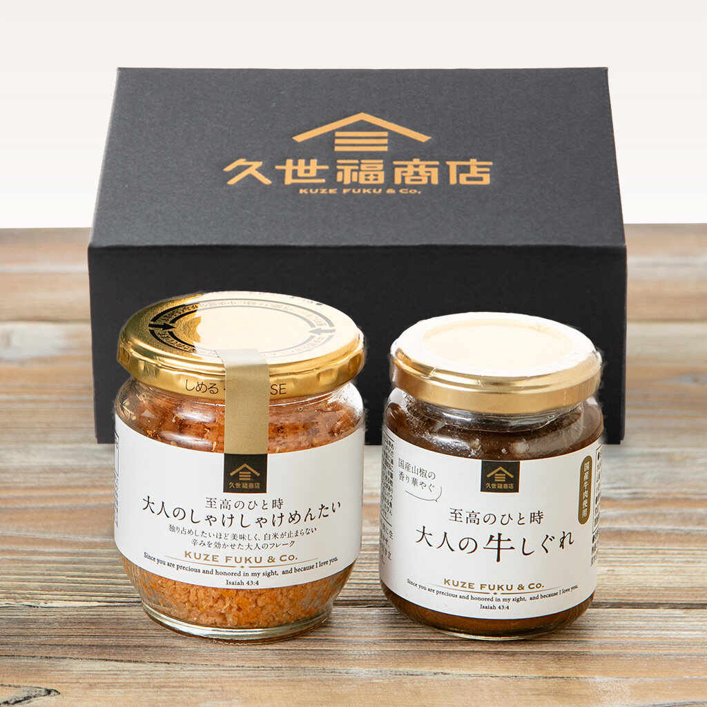 久世福で人気のご飯のお供のセット。明太子の辛さと鮭の優しい風味で愛される、久世福ごはんのお供人気No.1の「大人のしゃけしゃけめんたい」と、国産牛肉と国産生姜でじっくり煮込んだ「牛しぐれ」を化粧箱へ。もらって嬉しい久世福自慢のギフトです。