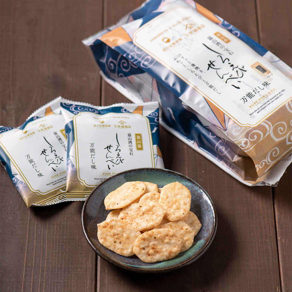 久世福の万能だし味のしろえびせんべい。ふわっと香るだしと、「富山湾の宝石」と称されるしろえびの旨みが織りなす贅沢な味わい。味はもちろん、作業中もつまみ易いお煎餅の大きさとしっかりとした個包装は職場で褒められること間違いなしです。