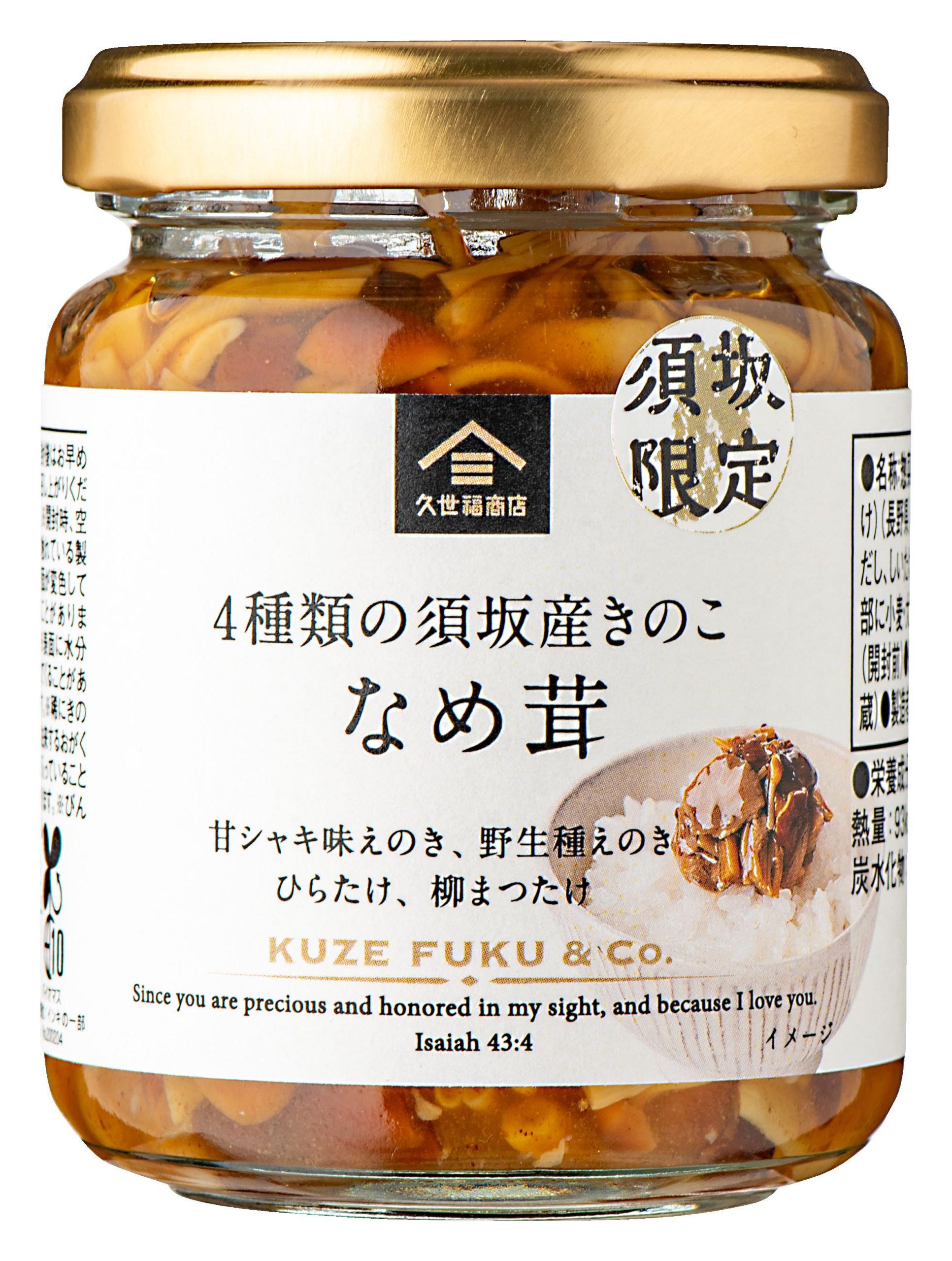 須坂市で育ったきのこを使用したなめ茸です。きのこは甘シャキ味えのき・野生種えのき・ひらたけ・やなぎまつたけを使用しています。【甘シャキ味えのき:通常のえのきよりカサが大きくほんのりした甘み】【野生種えのき:大き目で厚いカサで旨みと風味が豊か】【ひらたけ:食べ応えがある食感で癖がなく、味なじみがよい為他のきのこや調味料の味わいを底上げ】【やなぎまつたけ:まつたけの名がつく通り食感がよく香りが豊か】 様々な特徴を持つきのこを調味料とともにじっくり煮込み、食感も楽しい風味豊かななめ茸に仕上げました。(税込540円)
