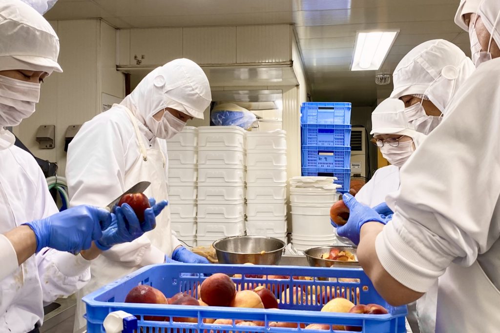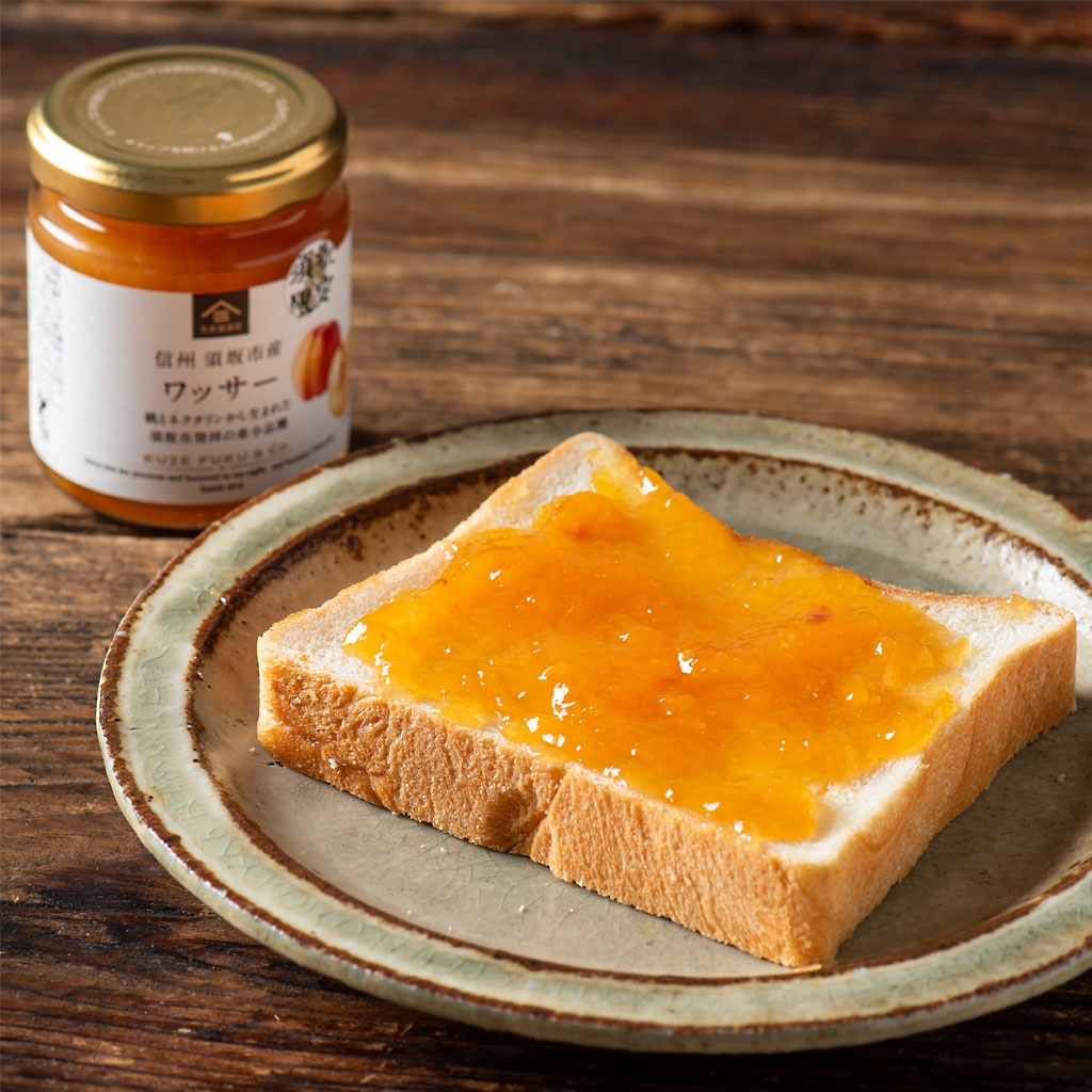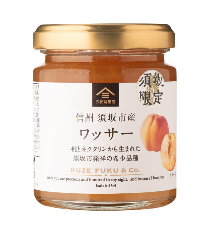 久世福商店イオンモール須坂店出店にあわせ、須坂発祥の果実「ワッサー」を使用したジャムを開発しました。「ワッサー」は、桃とネクタリンが自然交配した品種で、桃らしい甘みとネクタリンの酸味が合わさった甘酸っぱい味わいが特徴です。須坂市産ワッサーを工場で生の果実から加工しました。果実本来の味わいを最大限活かす配合で作っています。(税込540円)