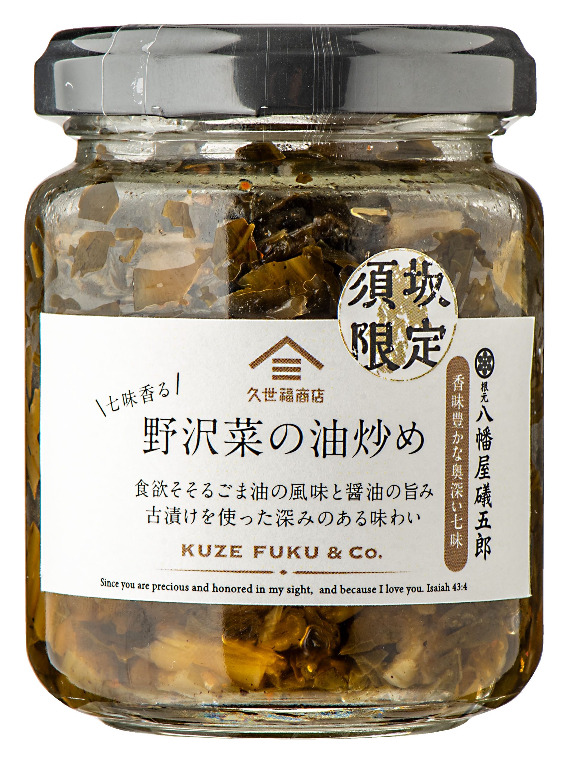 信州の郷土料理「野沢菜の油炒め」に信州の老舗「八幡屋礒五郎」の風味良い七味を加えた、ごま油の香ばしさと醤油の旨みが効いた逸品です。北信濃では、11月頃に漬け込んだ野沢菜漬けの発酵が進む翌年の春頃、醤油や砂糖、唐辛子と一緒に野沢菜漬けを油で炒めた「野沢菜の油炒め」をごはんのお供にしています。そんな北信濃の家庭の味を瓶に詰めました。(税込540円)