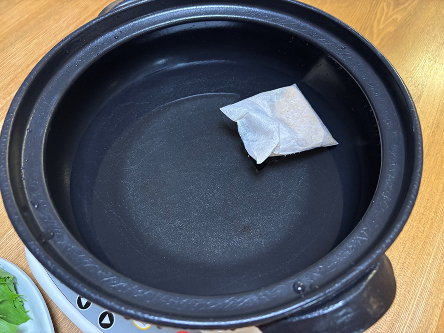 まずはしゃぶしゃぶから。だしパックをお鍋に入れます。5分ほどグツグツ。