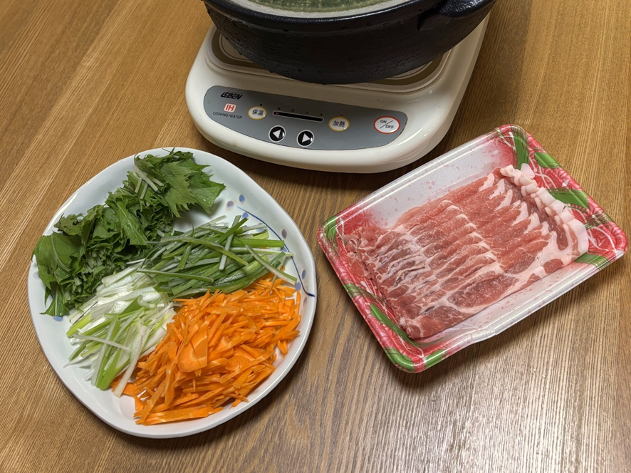 蓋をあけると食欲をそそる濃厚なだしの香りが!ネギや水菜、ニンジンの千切りを入れて、いざ!しゃぶしゃぶタイムです。