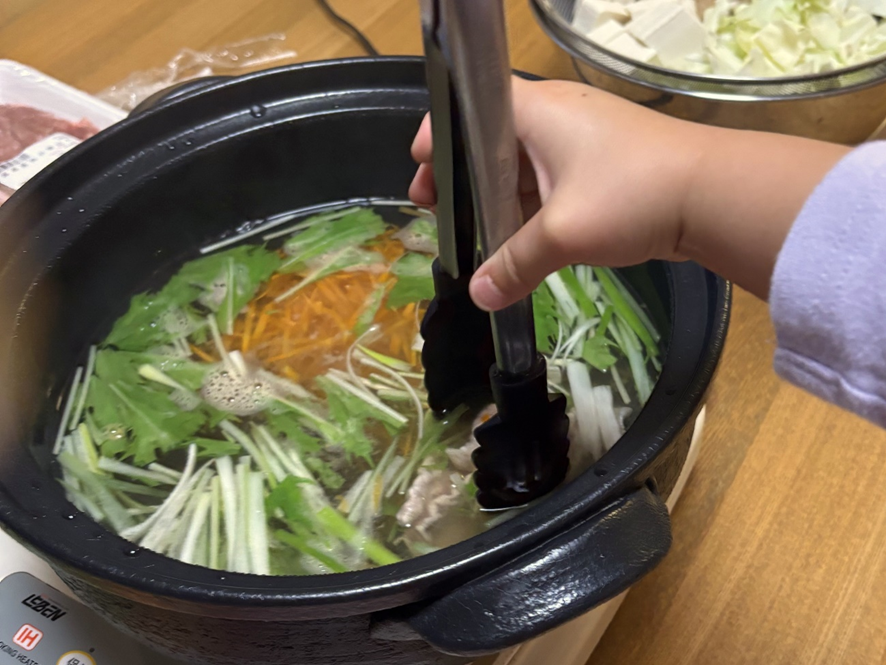 娘も「しゃぶしゃぶしてみたい!」とのことで、私がサポートしながらトングでしゃぶしゃぶ。楽しそうでした。