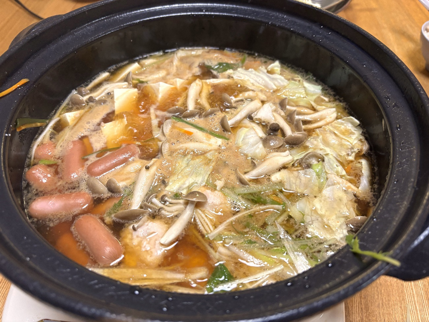 しばらく煮込めば美味しそうな味噌鍋の出来上がりです。(写真映りがいまいちなのはご愛嬌で…!)