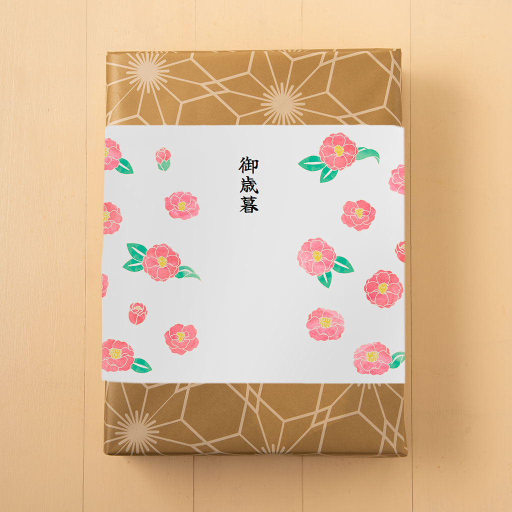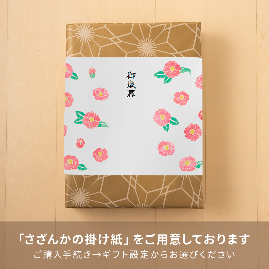 冬のギフトにピッタリの「さざんか」をあしらった掛け紙をご用意しております。表書き、名入れに対応しておりますので、ぜひご利用ください。