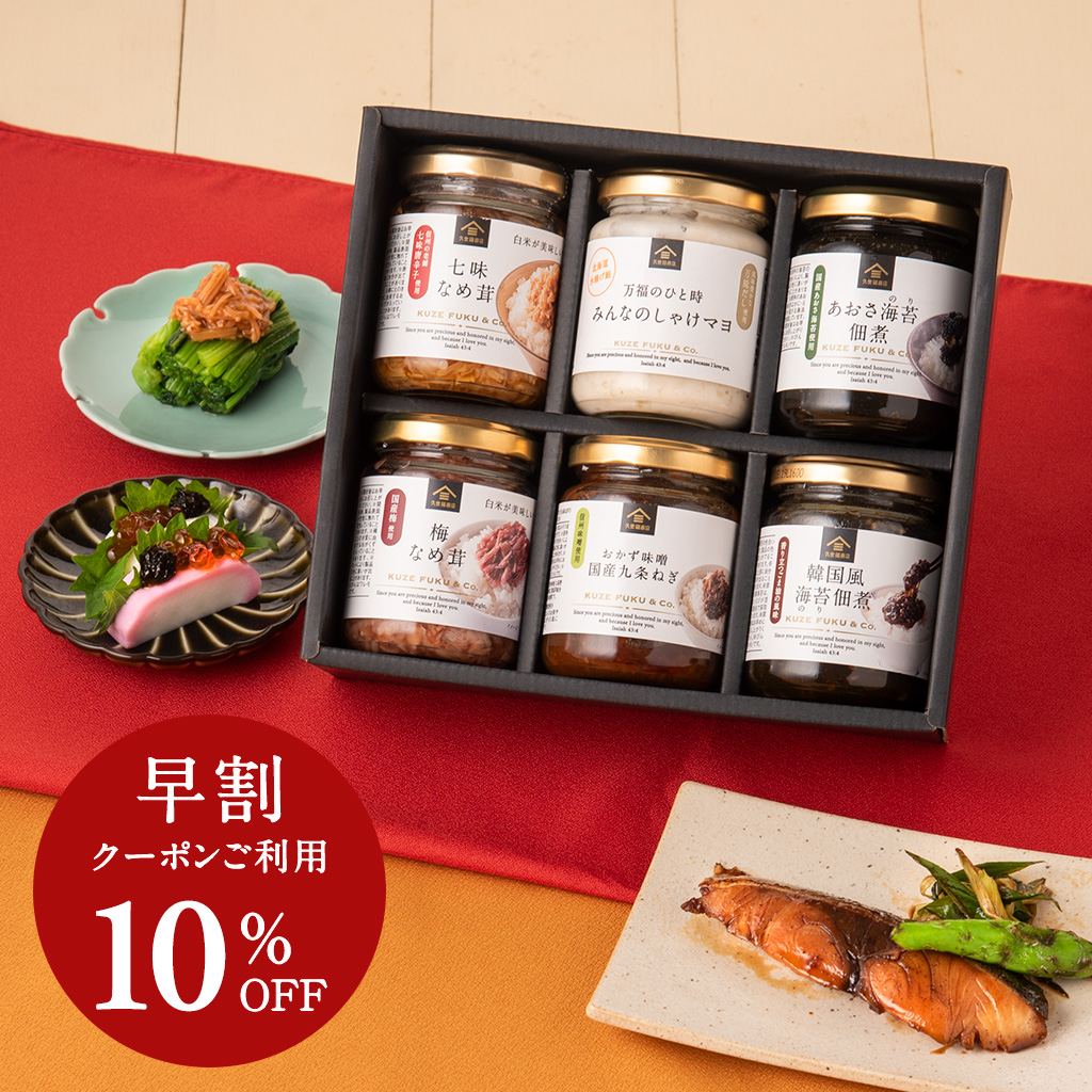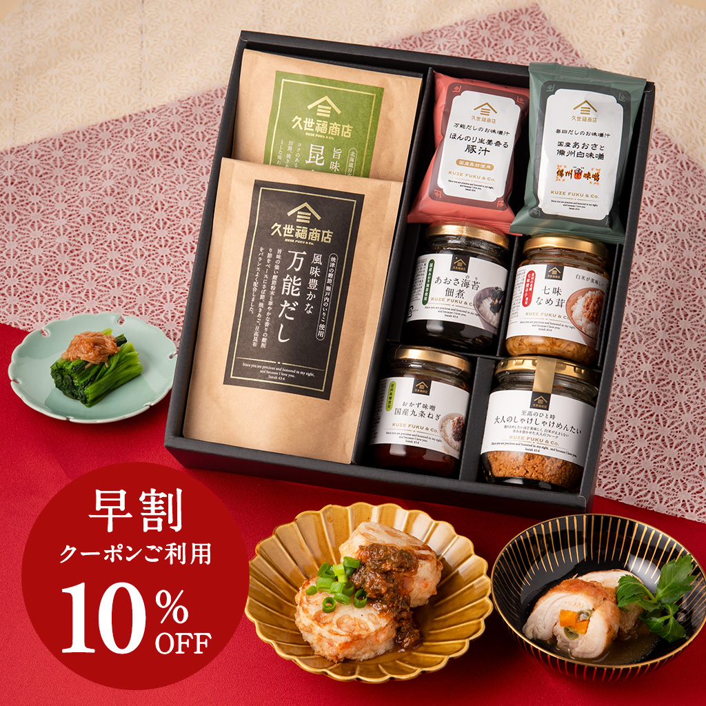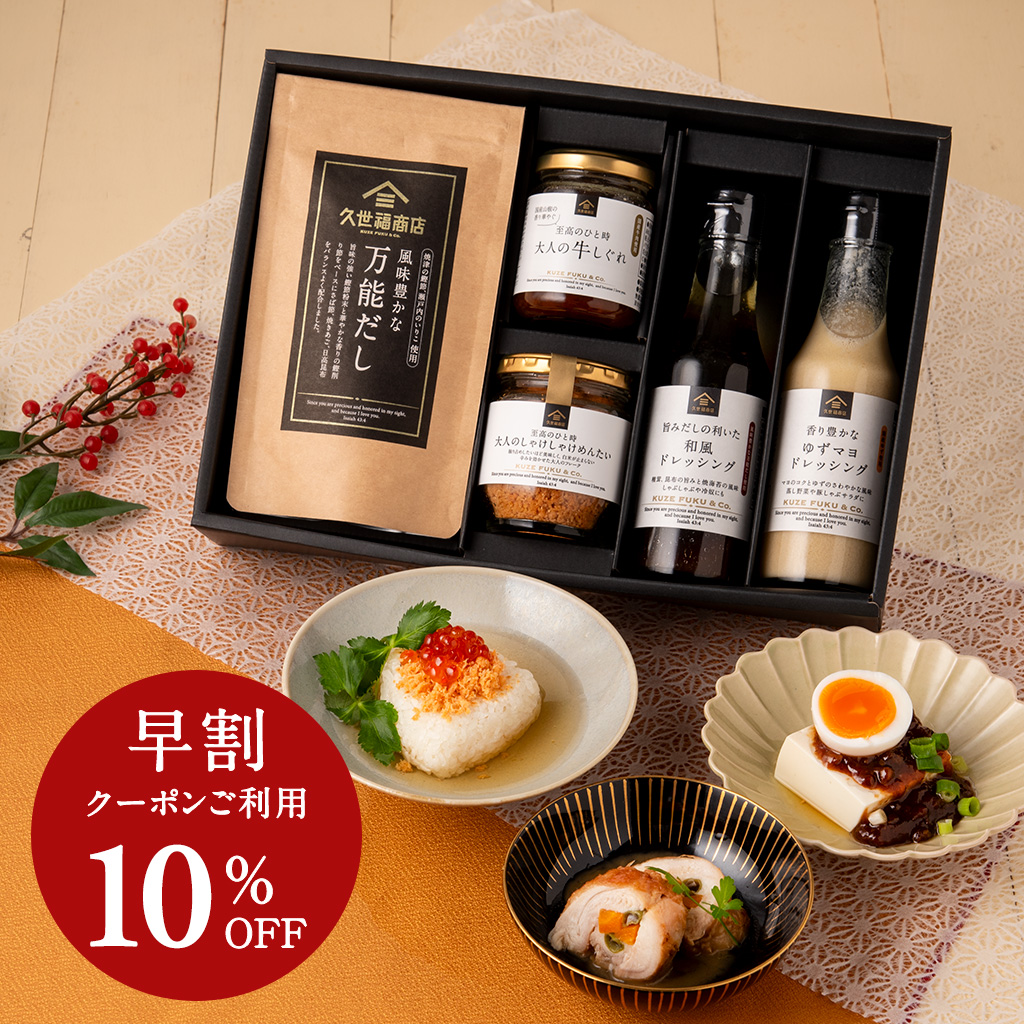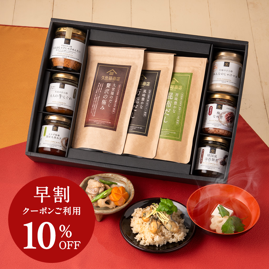 久世福商店の看板商品、「万能だし」やTV放映でも話題の「大人のしゃけしゃけめんたい」など、当店の定番商品を詰め合わせた人気ギフト。和調味料も入って、年末の食卓を華やかに演出してくれるおすすめのセットです。