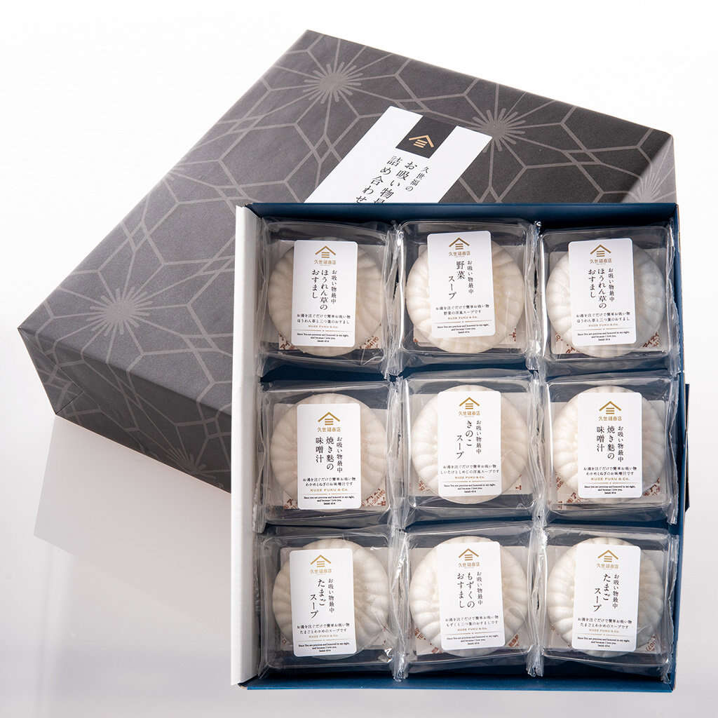 久世福こだわりの「だし」で仕上げた贅沢な味噌汁セット。和モダンなパッケージで、季節を問わず喜ばれるギフトです。寒い季節に心も体も温まる一杯を、大切な方へ。
