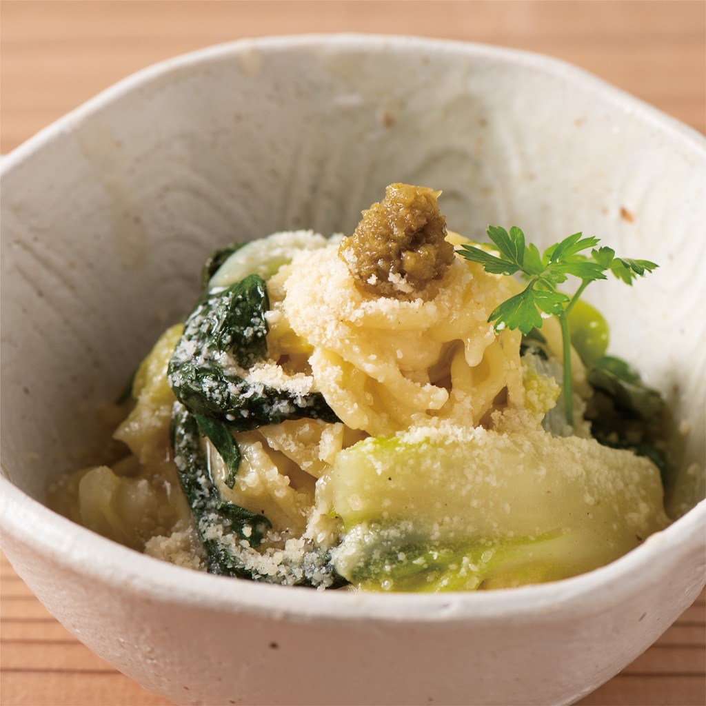 あっさりとしたちゃんこ鍋に、ピリッと爽やかな柚子胡椒が香る和風パスタ。仕上げに粉チーズをかければ、絶品の〆が完成します。