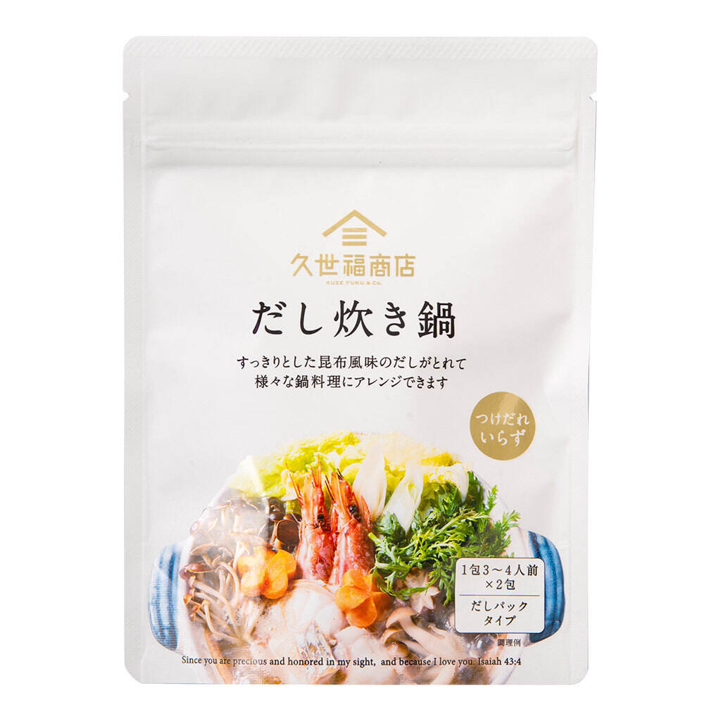 これひとつで味が決まる、久世福商店の鍋専用だしパックです。北海道産利尻昆布や焼津製造のかつお節など、こだわりの素材を贅沢に使用。塩味ベースのコク深いだしが具材の旨みを引き立て、つけだれいらずで手軽に本格鍋に!