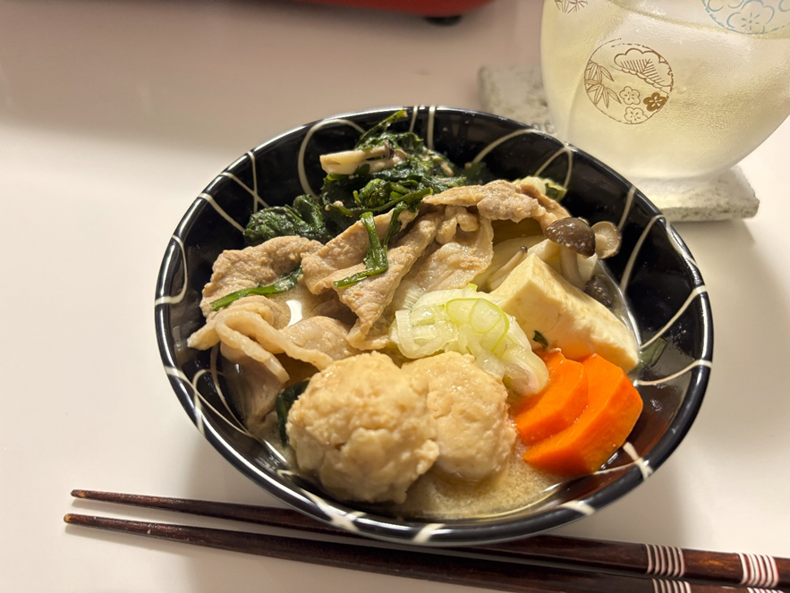 クリーミーなつゆをまとった野菜や肉はほんのり甘く、子供たちもパクパク食べていました。このつゆは家では作れない!