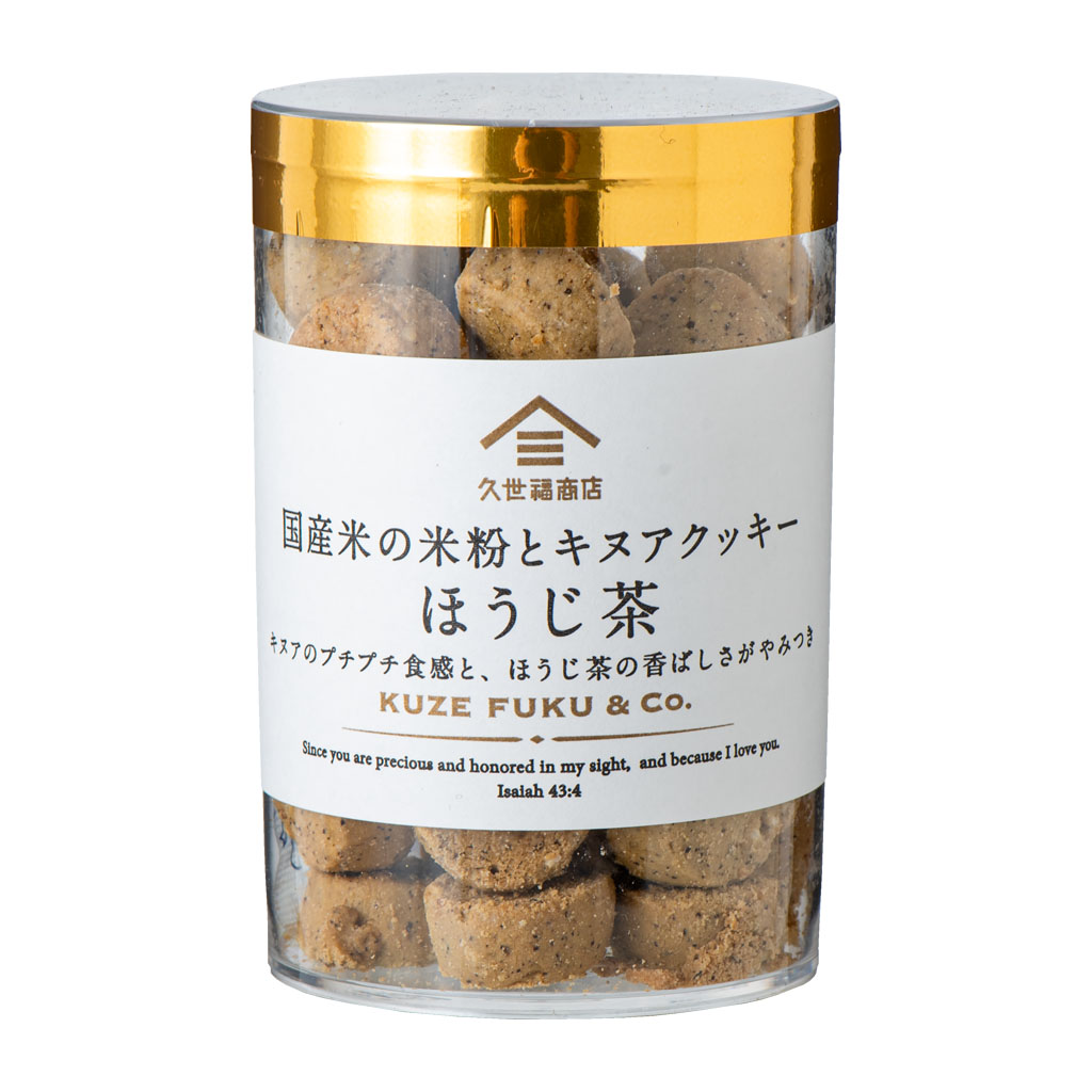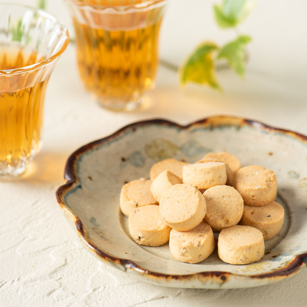 米粉と大豆粉の生地に焙煎キヌアを練り込み、プチプチとした軽い歯ごたえが特徴。ほんのり味噌味のあと引くおいしさが、ほうじ茶の香ばしさとマッチ。グルテンフリーで、ちょっとしたプレゼントにも最適です。