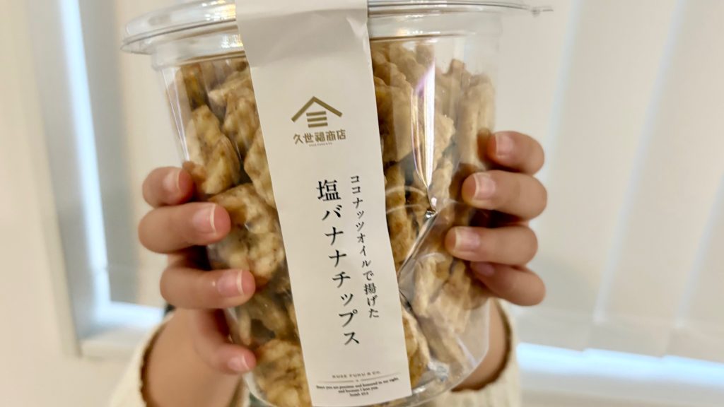 こちらは子どもも大好きな塩バナナチップス。子どもに持ってもらいましたが、好きすぎて力が入ってパッケージがつぶれてしまいました。子どもと私の、冬休み中のご褒美としたいと思います。
