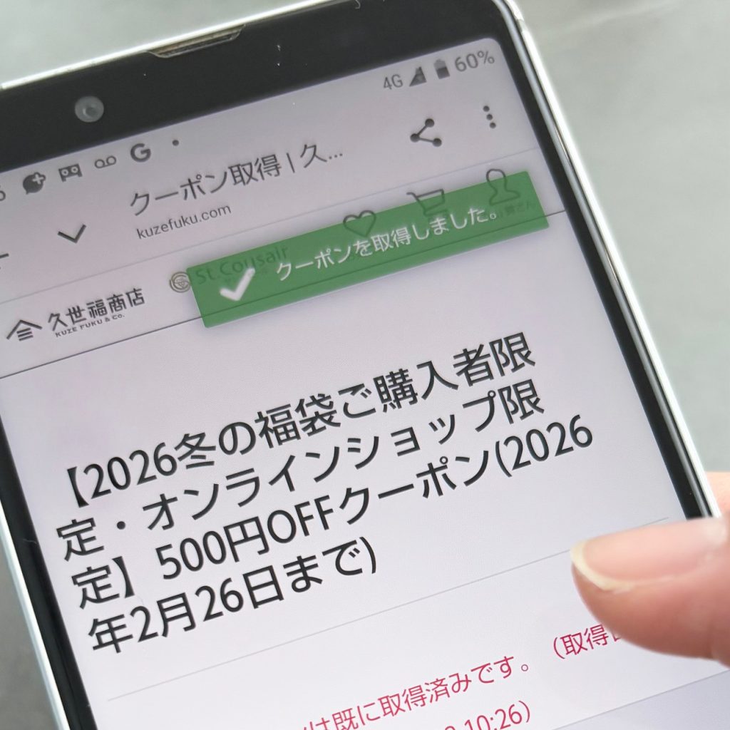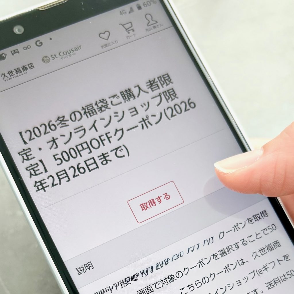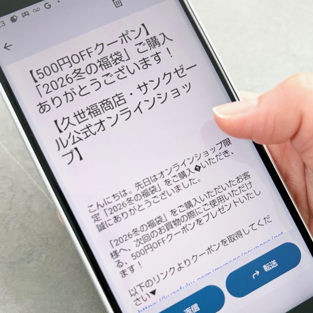 オンラインショップ限定福袋を購入すると、メールで500円クーポンが届きます。