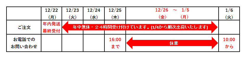 現在、年内発送の受付は終了し、年始以降の発送・日時指定にてご注文を承っております。